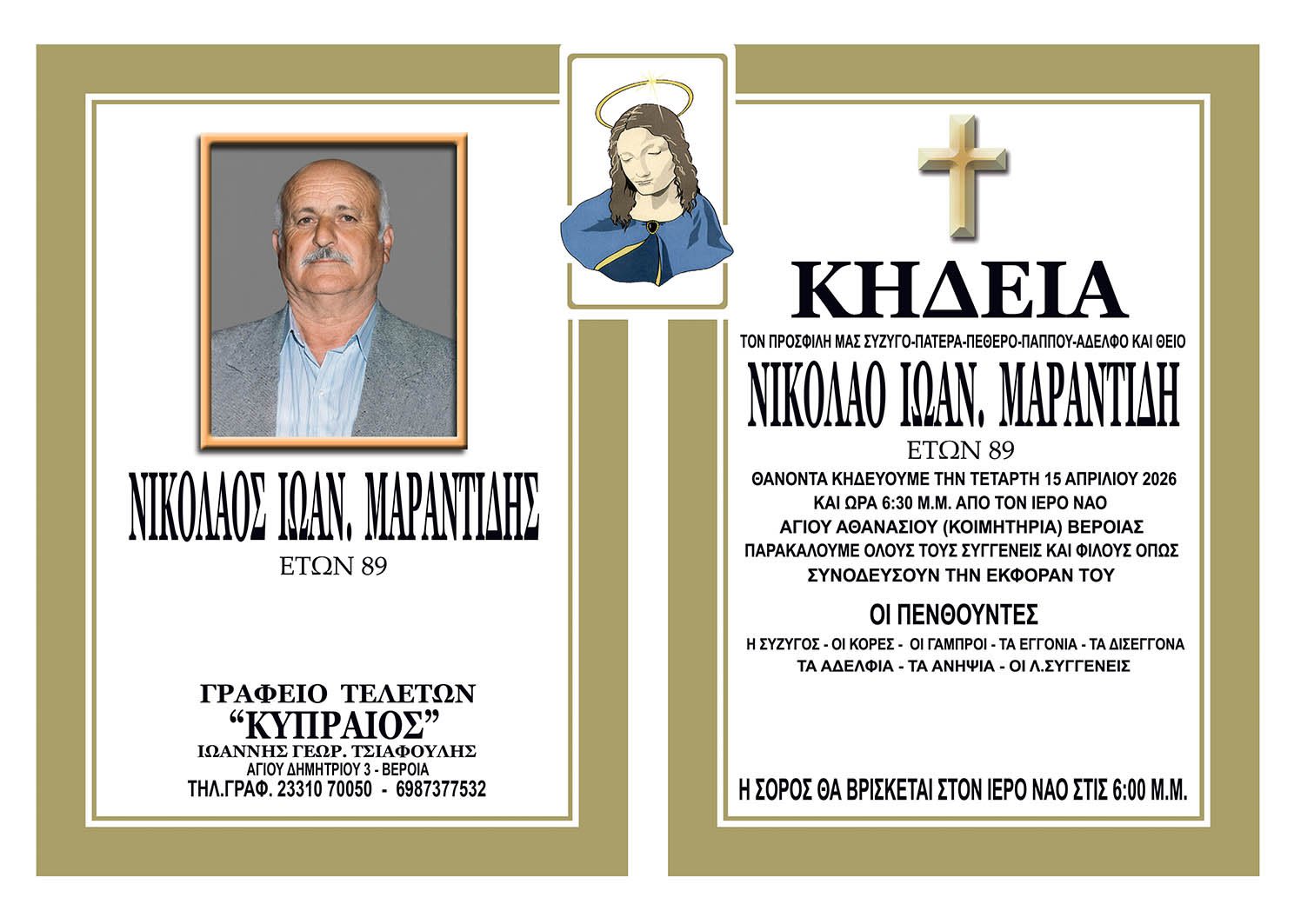 Έφυγε από τη ζωή και κηδεύεται σήμερα Τετάρτη 15 Απριλίου 2026 στις 6.30 μ.μ. από τον Ιερό Ναό Αγίου Αθανασίου (Κοιμητήρια) Βέροιας ο Νικόλαος Μαραντίδης σε ηλικία 89 ετών.