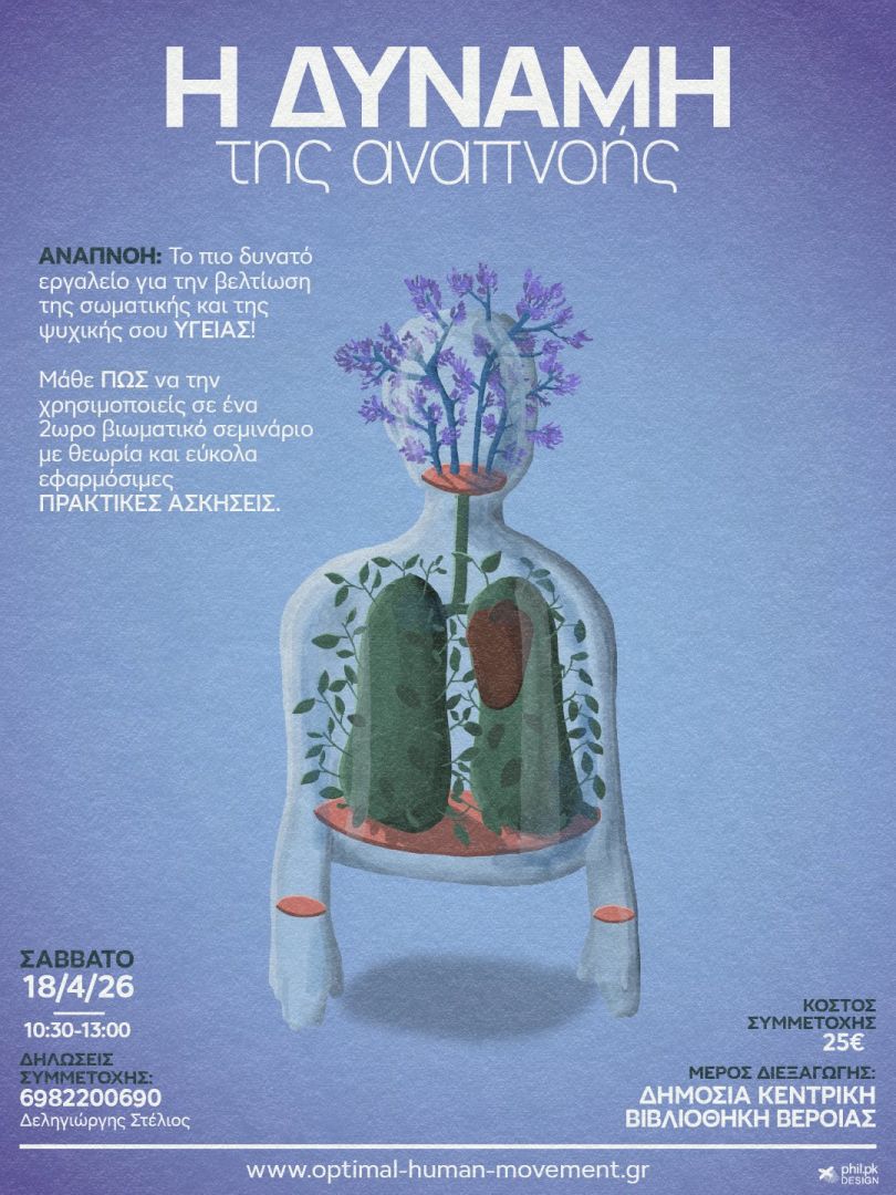 Πληροφορίες και δήλωση συμμετοχής: https://www.optimal-human-movement.gr/seminaria ή στο 6982200690 / Δεληγιώργης Στέλιος