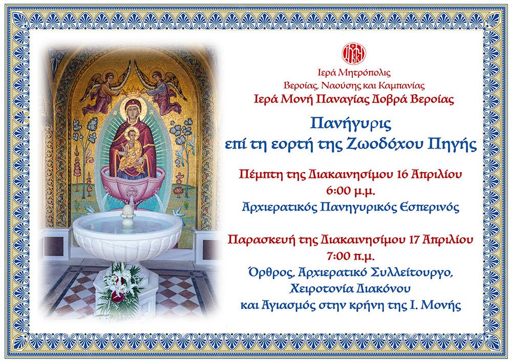 Την Παρασκευή της Διακαινησίμου εορτάζει και πανηγυρίζει η Ιερά Μονή Παναγίας Δοβρά Βεροίας, επί τη εορτή της Ζωοδόχου Πηγής, μιας από τις θεομητορικές εορτές της Υπεραγίας Θεοτόκου, η οποία αποτελεί και την κύρια πανήγυρη της Μονής.