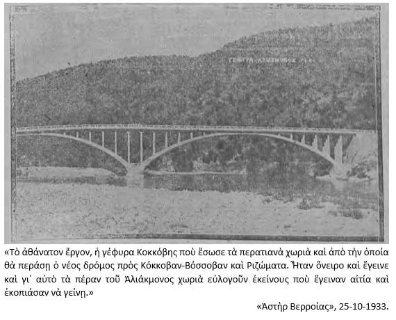 [2] Την ζεύξη του Αλιάκμονα, που θα τερμάτιζε την προαιώνια ταλαιπωρία της πέραν (νοτίως) αυτού περιοχής στην επικοινωνία της με την υπόλοιπη Ημαθία, και κυρίως με την Βέροια, ζητούσαν επίμονα και πιεστικά οι κάτοικοι των περίπου «50 χωρίων» της, - και υποστήριζαν, με θέρμη, οι εκάστοτε πολιτικοί εκπρόσωποι του Νομού (τότε Επαρχίας του Νομού Θεσσαλονίκης).