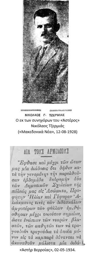 [4] Την εικόνα του διδασκαλικού κόσμου, ο έμπειρος εκδότης-διευθυντής του «Ἀστέρος» φρόντιζε, εντέχνως, να σκιάσει, μεταφέροντας, στο ίδιο φύλλο, της 11-07-1934, (φαινομενικά) άσχετα με την δικαστική του περιπέτεια παράπονα και αιτιάσεις γονέων κ.λπ. για συμπεριφορές εκπαιδευτικών: