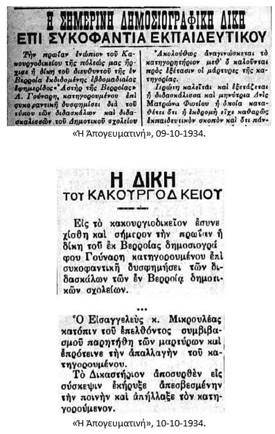 Τὴν πρωΐαν ἐνώπιον τοῦ Κακουργιοδικείου τῆς πόλεώς μας {= Θεσσαλονίκης} ἤρχισε ἡ δίκη τοῦ διευθυντοῦ τῆς ἐν Βερροίᾳ ἐκδιδομένης ἑβδομαδιαίας ἐφημερίδος “Ἀστὴρ τῆς Βερροίας” Ἰ. Γούναρη, κατηγορουμένου ἐπὶ συκοφαντικῇ δυσφημίσει διὰ τοῦ τύπου τῶν διδασκάλων καὶ διδασκαλισσῶν τοῦ Δημοτικοῦ σχολείου Βερροίας.