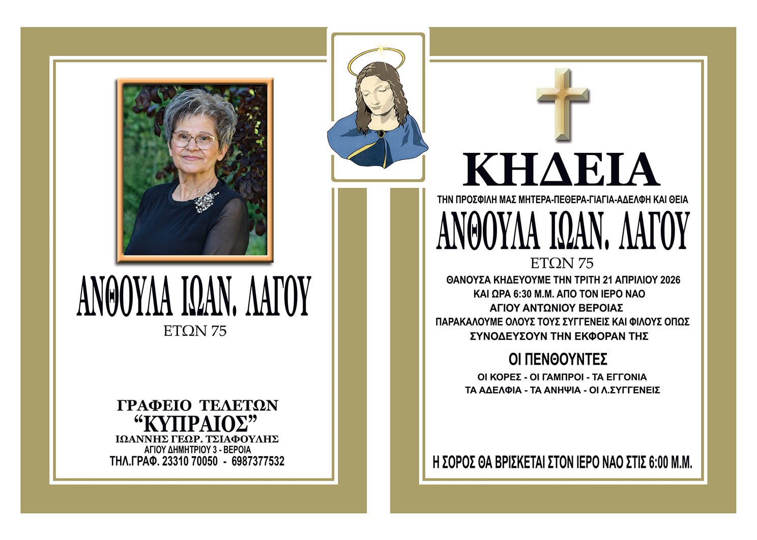 Έφυγε από τη ζωή και κηδεύεται σήμερα Τρίτη 21 Απριλίου 2026 στις 6.30 μ.μ. από τον Ιερό Ναό Αγίου Αντωνίου Βέροιας η Ανθούλα Ιωαν. Λαγού σε ηλικία 75 ετών.