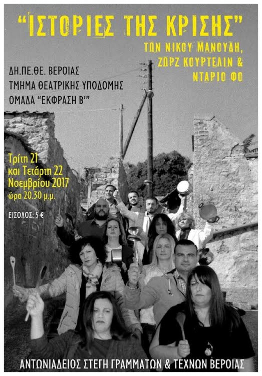 Την παράσταση «Ιστορίες της κρίσης» των Νίκου Μανούδη, Zώρζ Κουρτελίν και Ντάριο Φο παρουσιάζει η Θεατρική Σκηνή Ενηλίκων «ΕΚΦΡΑΣΗ Β», του Τμήματος Θεατρικής Υποδομής του ΔΗ.ΠΕ.ΘΕ. Βέροιας.
