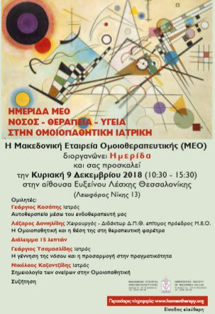 Η Μακεδονική Εταιρεία Οµοιοθεραπευτικής (ΜΕΟ) διοργανώνει ηµερίδα την Κυριακή 9 Δεκεµβρίου 2018 (10:30 - 15:30) στην αίθουσα Ευξείνου Λέσχης Θεσσαλονίκης (Λεωφόρος Νίκης 13), με θέμα «Νόσος – θεραπεία- Υγεία στην ομοιοπαθητική ιατρική».