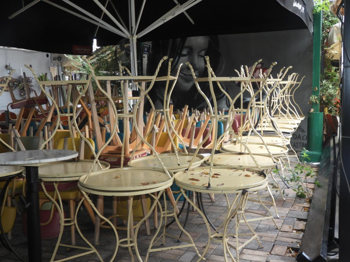 Αναποδογυρισμένα τραπεζάκια, καρέκλες κολλημένες στους τοίχους και τις τζαμαρίες η μία επάνω στην άλλη και μια θλιβερή σιωπή, συνθέτουν την εικόνα του εμπορικού πεζόδρομου της Βέροιας, στην πιάτσα των καφέ… Είναι η ζοφερή αποτύπωση της ζωής με τον covid και τα περιοριστικά μέτρα για την αποφυγή της διασποράς του φονικού ιού.