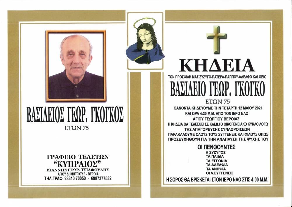 Απεβίωσε σε ηλικία 75 ετών ο Βασίλειος Γεωρ. Γκόγκος.