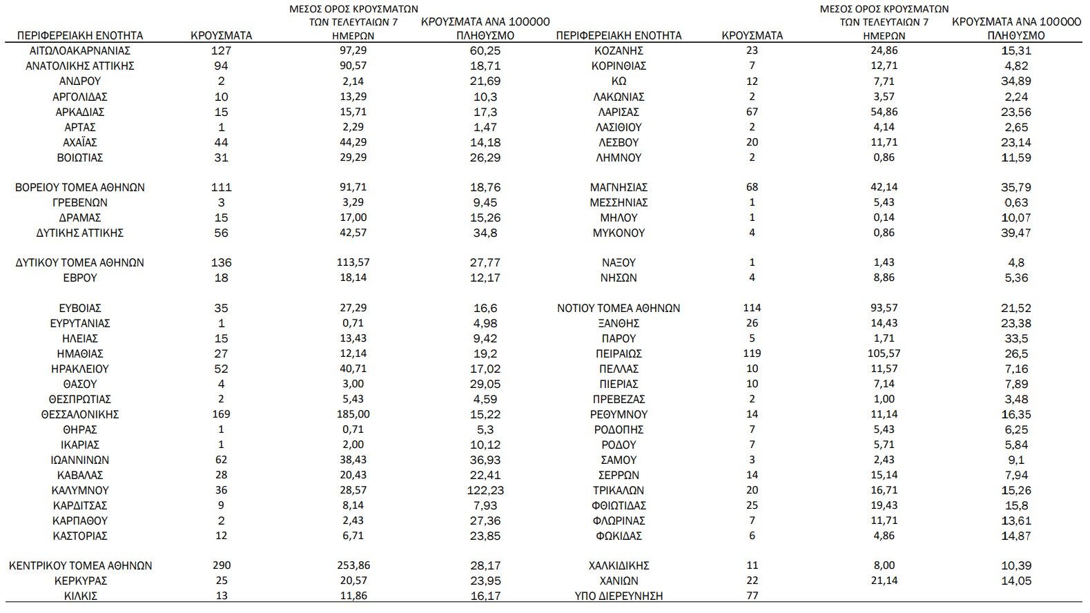 Η κατανομή των 2.160 νέων εγχώριων κρουσμάτων ανά Περιφερειακή Ενότητα παρουσιάζεται στον κατωτέρω πίνακα: